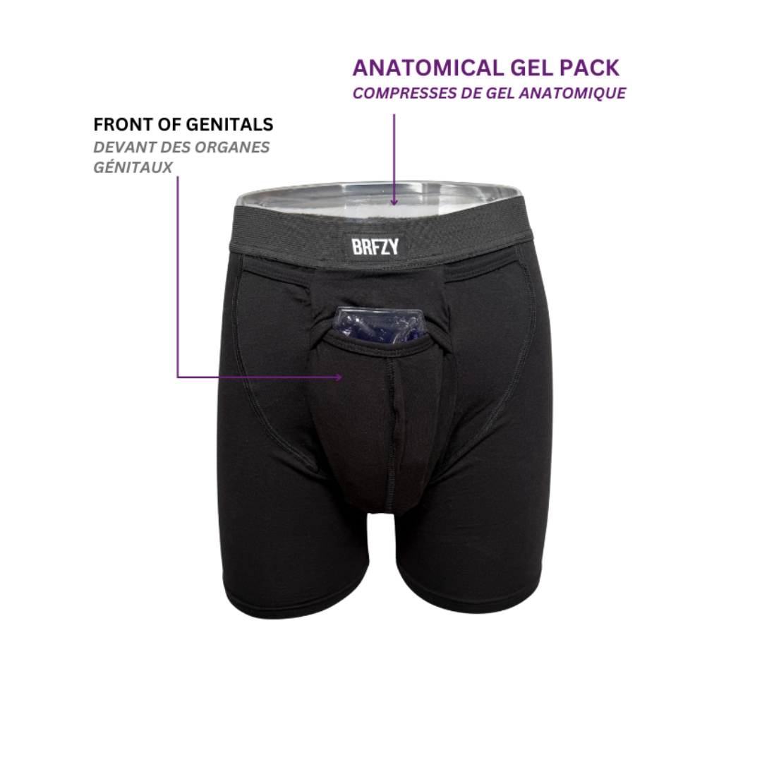Traditionally briefs weren't designed to hold an ice pack. BRFZY Recovery Boxer Briefs include a built-in pocket shaped to keep a gel pack in place against the surgical area, so you're not stuck holding a bag of frozen peas in your waistband.